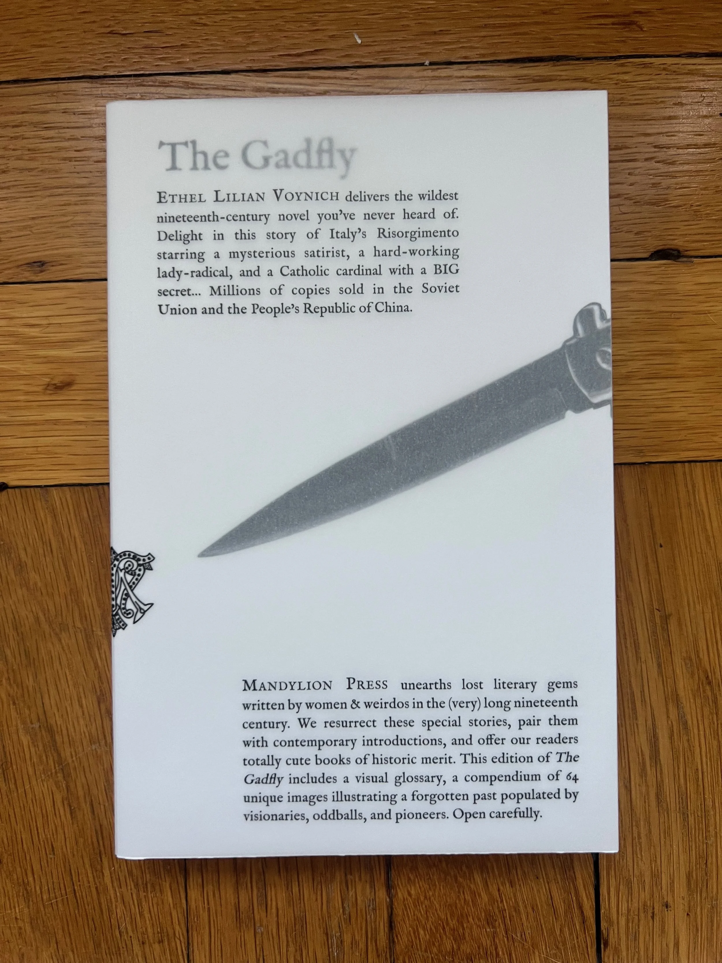 Ethel Lilian Voynich delivers the wildest nineteenth-century novel you’ve never heard of. Delight in this story of Italy’s Risorgimento starring a mysterious satirist, a hard-working lady-radical, and a Catholic cardinal with a BIG secret… Millions of copies sold in the Soviet Union and the People’s Republic of China.